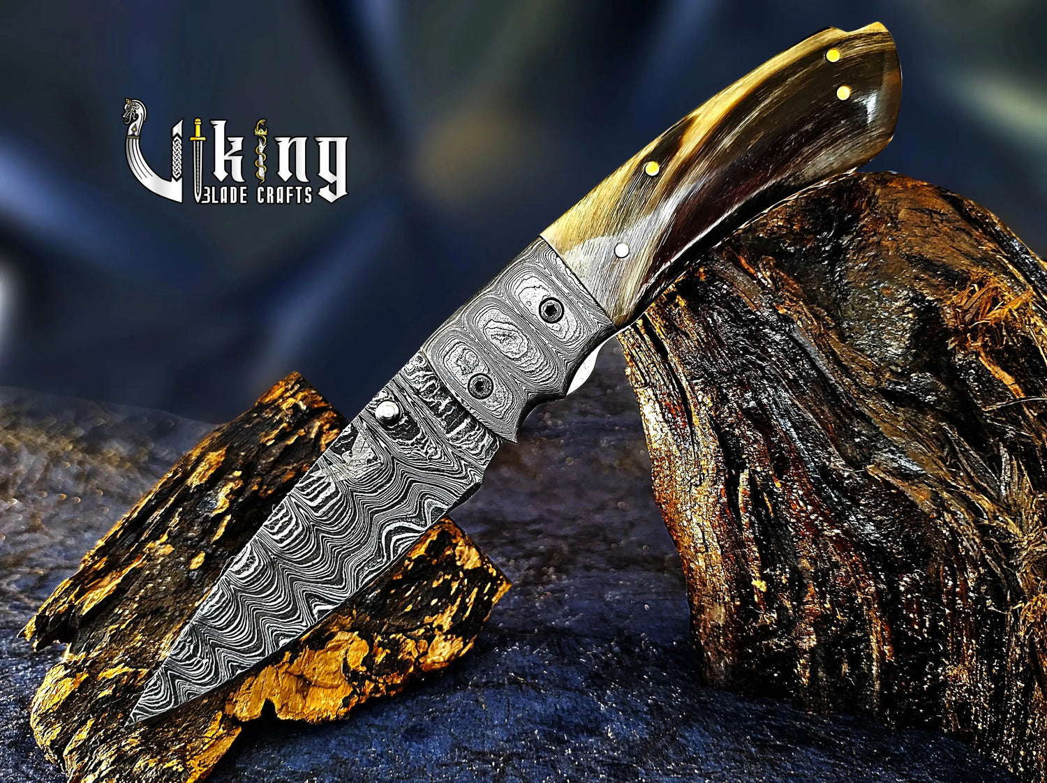 Hand-Forged Damascus Steel Folding Knife | Raindrop Pattern | Ram Horn Handle
