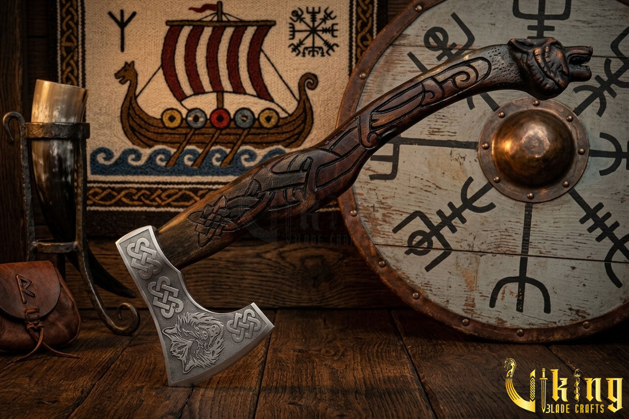 The Fenrir Viking Axe | Wolf Head Carving | Hand-Forged Carbon Steel