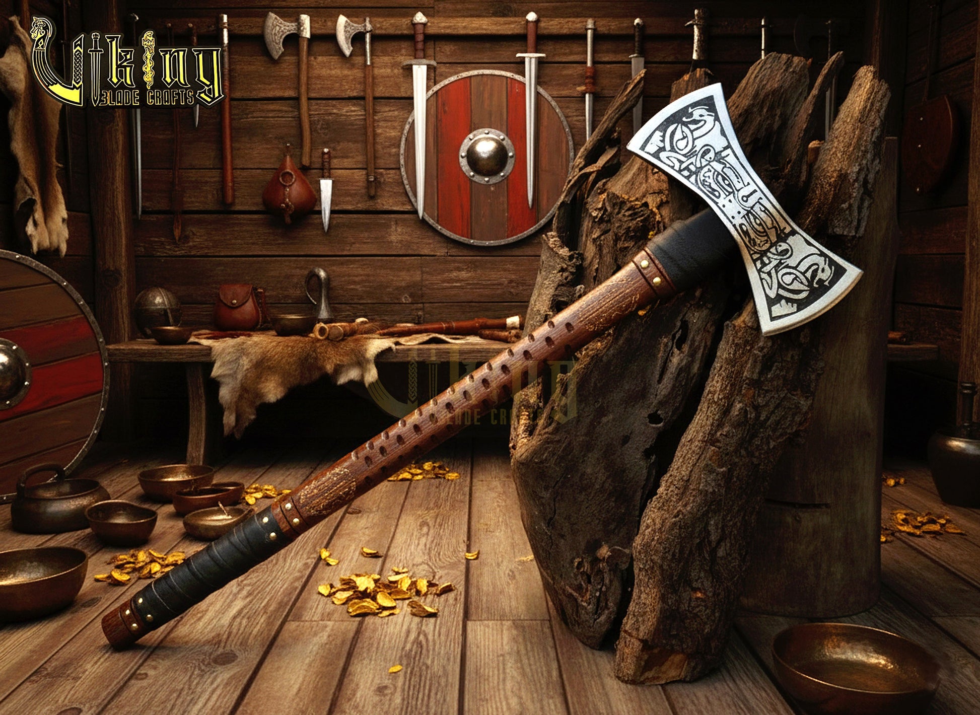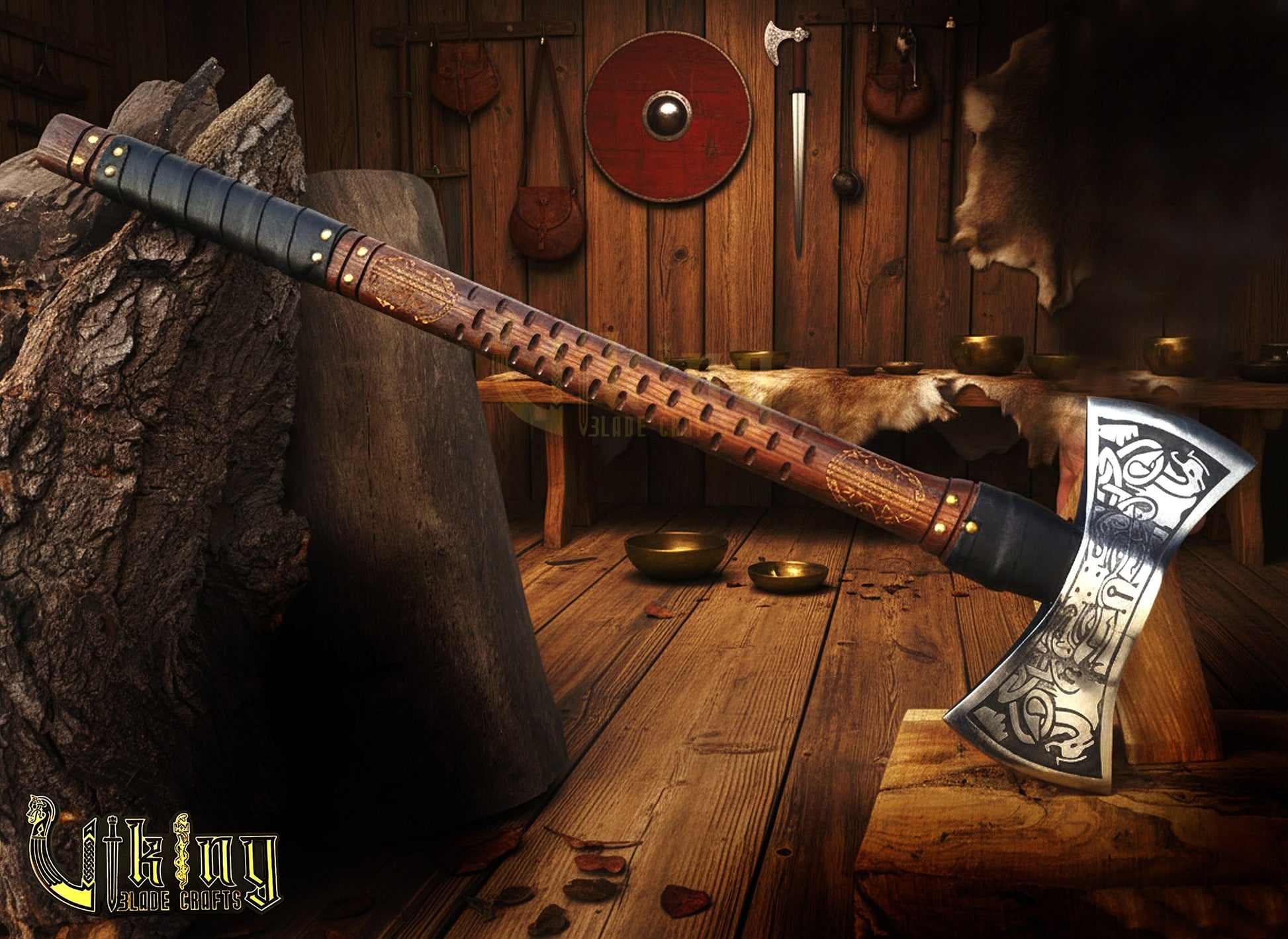 The Helm of Awe 30" Viking Axe & Carved Wooden – Norse Warrior Axe